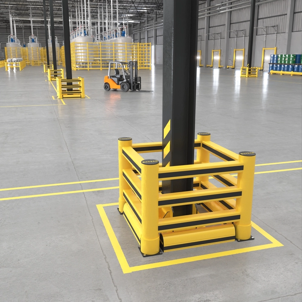 De kunststof 3R kolombeschermer met extra stootrand op de grond is ontworpen om draagkolommen maximaal te beschermen tegen schade veroorzaakt door transportvoertuigen zoals heftrucks en palletwagens. Dankzij de extra stootrand dicht bij de grond worden kolommen nog beter beschermd tegen impact op lage niveaus, waar de kans op aanrijdingen het grootst is. Deze duurzame kolombeschermer is gemaakt van flexibel kunststof dat na impact terugveert en zowel de kolom als de voertuigen beschermt tegen ernstige schade. Het modulaire ontwerp maakt installatie eenvoudig en aanpasbaar aan verschillende kolomformaten. Geschikt voor binnen- en buitengebruik, zoals magazijnen, industriële terreinen en parkeergarages.